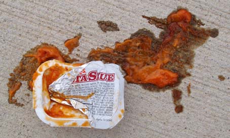 Now this is when the fun starts. Unloading the pasta sauce takes a lot of work. You have to open every cardboard box with scissors, and then remove the pasta sauce packets from another smaller box within each box. Both boxes then need to be compacted and put in to a trash bag. I was given two trash bags, which were able to hold about 2% of the total cardboard. (In exchange for 6 more sauce packets, the garage attendants give me a few more garbage bags. God Bless the Polish. Every one.) Next, the sauce packets have to go into the trash bags, which are to be carried to the site. Pasta sauce is not light, and the trash bags all tear open en route.